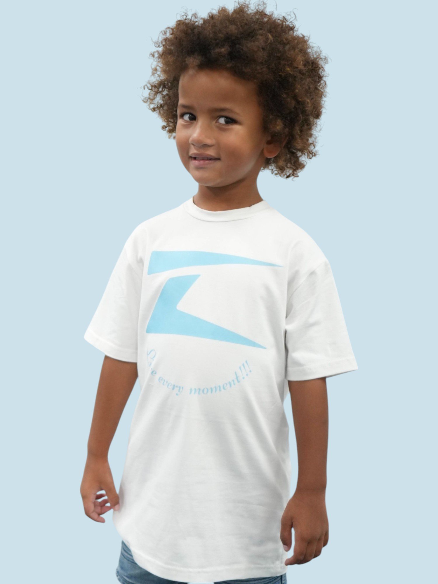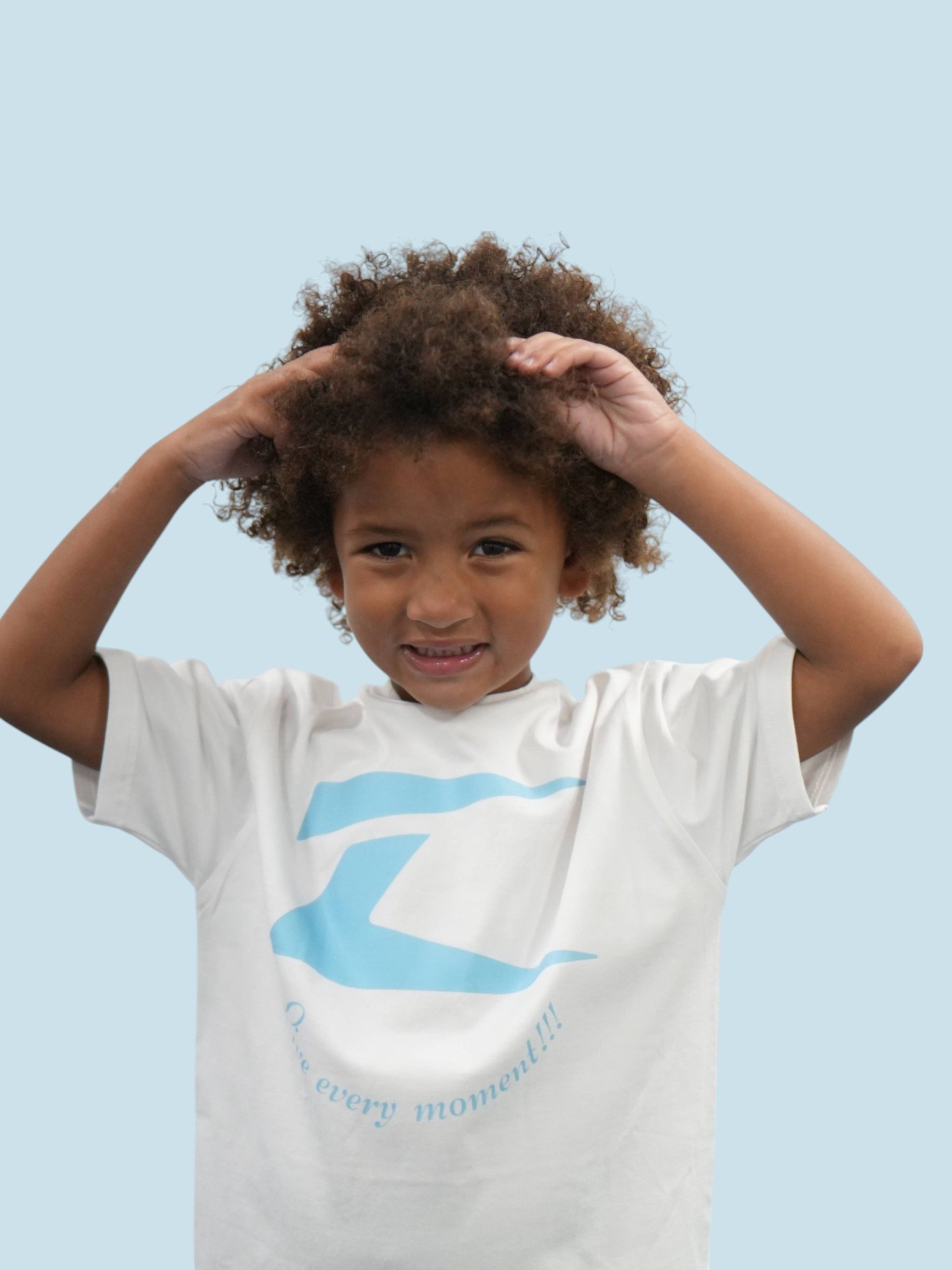 The design of this tee is driven by a philosophy that combines functionality with an inspirational message. The white canvas of the T-shirt provides a clean backdrop that makes the light blue print pop, creating a visually appealing contrast. The phrase “Be every moment!!!” is not only a design element but also a call to action that motivates children to embrace life with enthusiasm and positivity.